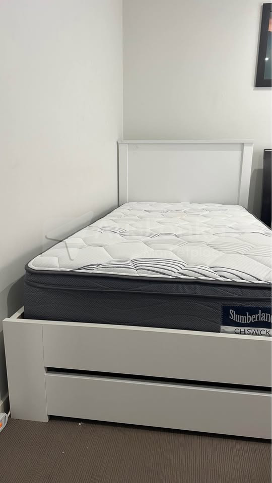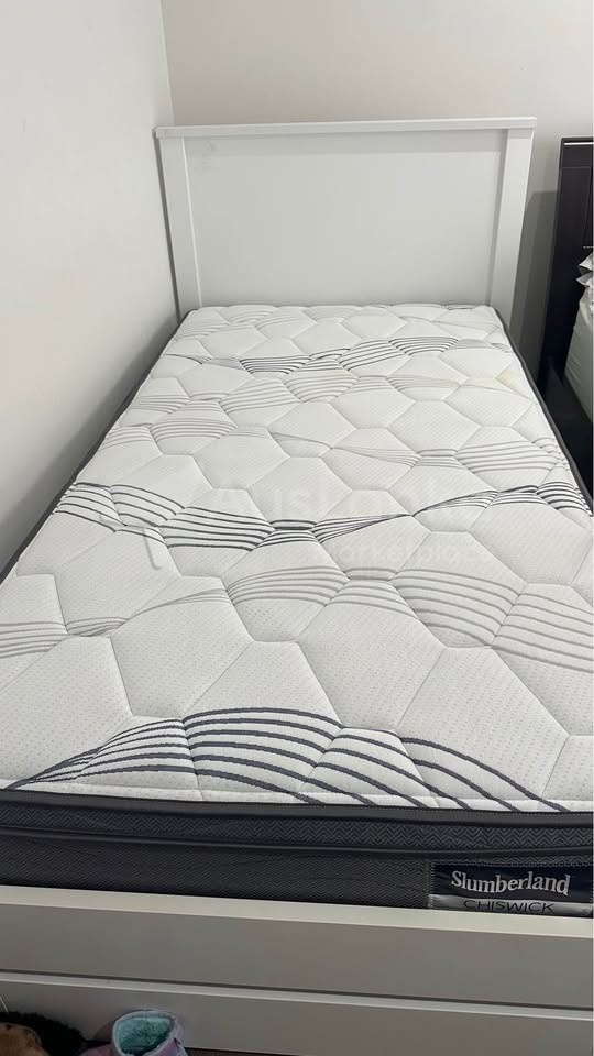 Selling a stylish white king single bed frame in great condition, complete with a comfortable Slumberland Chiswick mattress.
